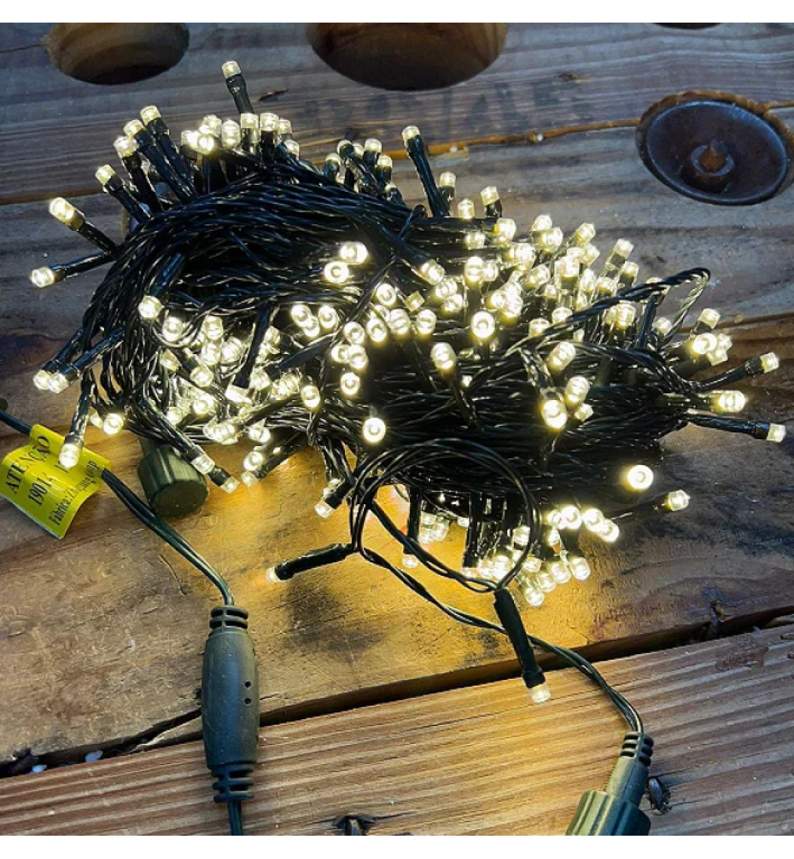 Cordão de Led com 300 lâmpadas de Led fixo (não possui opção de piscar) na cor branco quente (amarelada). Pode ser usada para diversos tipos de decoração, desde decorações natalinas até o uso em festas de aniversários ou casamento.