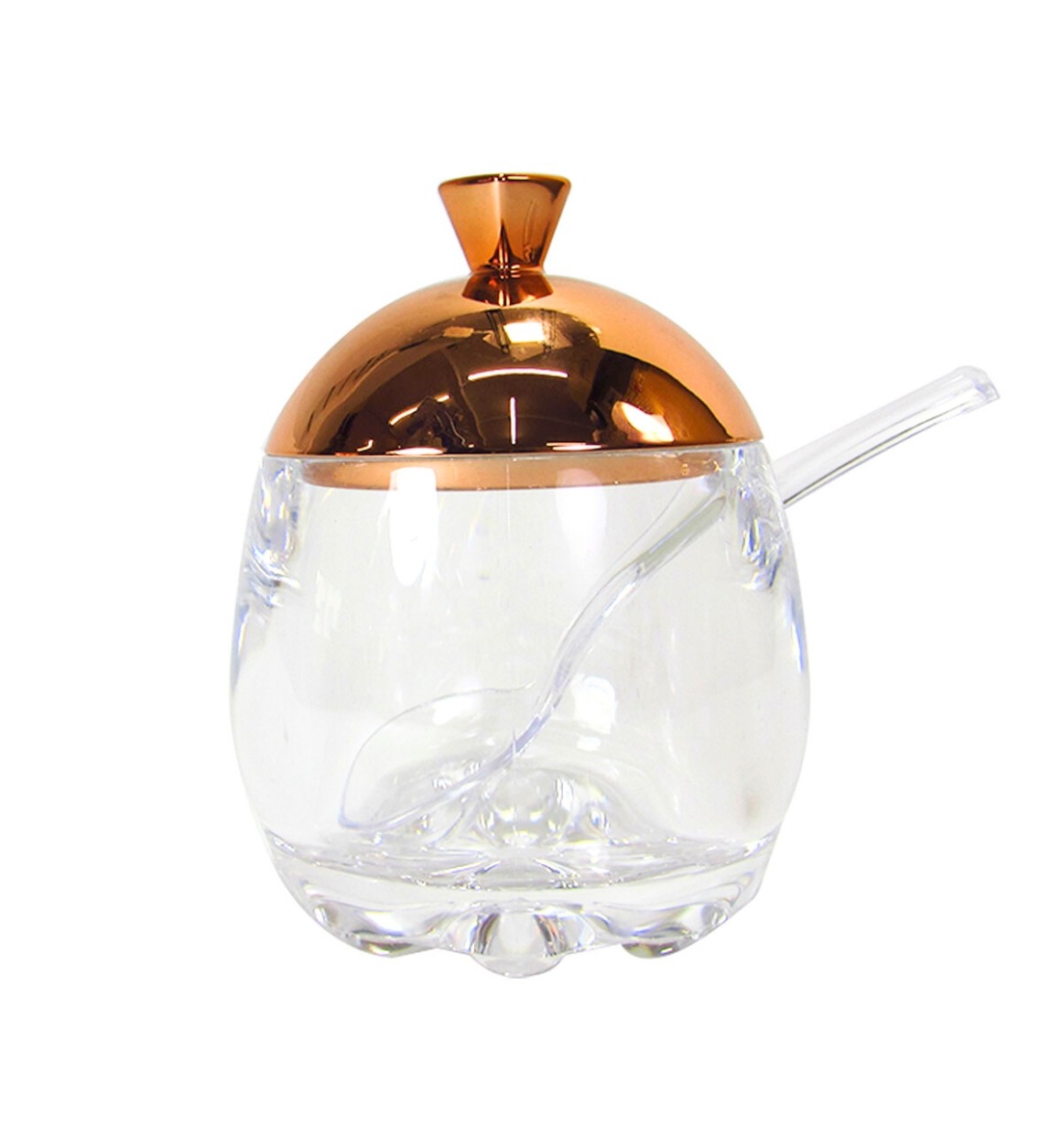 AÇUCAREIRO ACRÍLICO TRANSPARENTE COM COLHER E TAMPA GOLD ROSE 7CM - MG2979