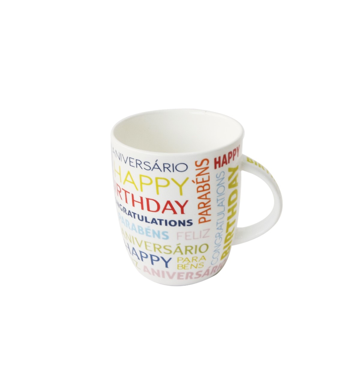 Caneca de porcelana com frases de Parabéns e Feliz Aniversário.