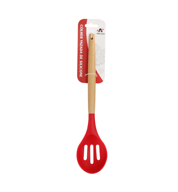 COLHER VAZADA DE SILICONE COM CABO DE MADEIRA 31,5CM - 3277-VM.