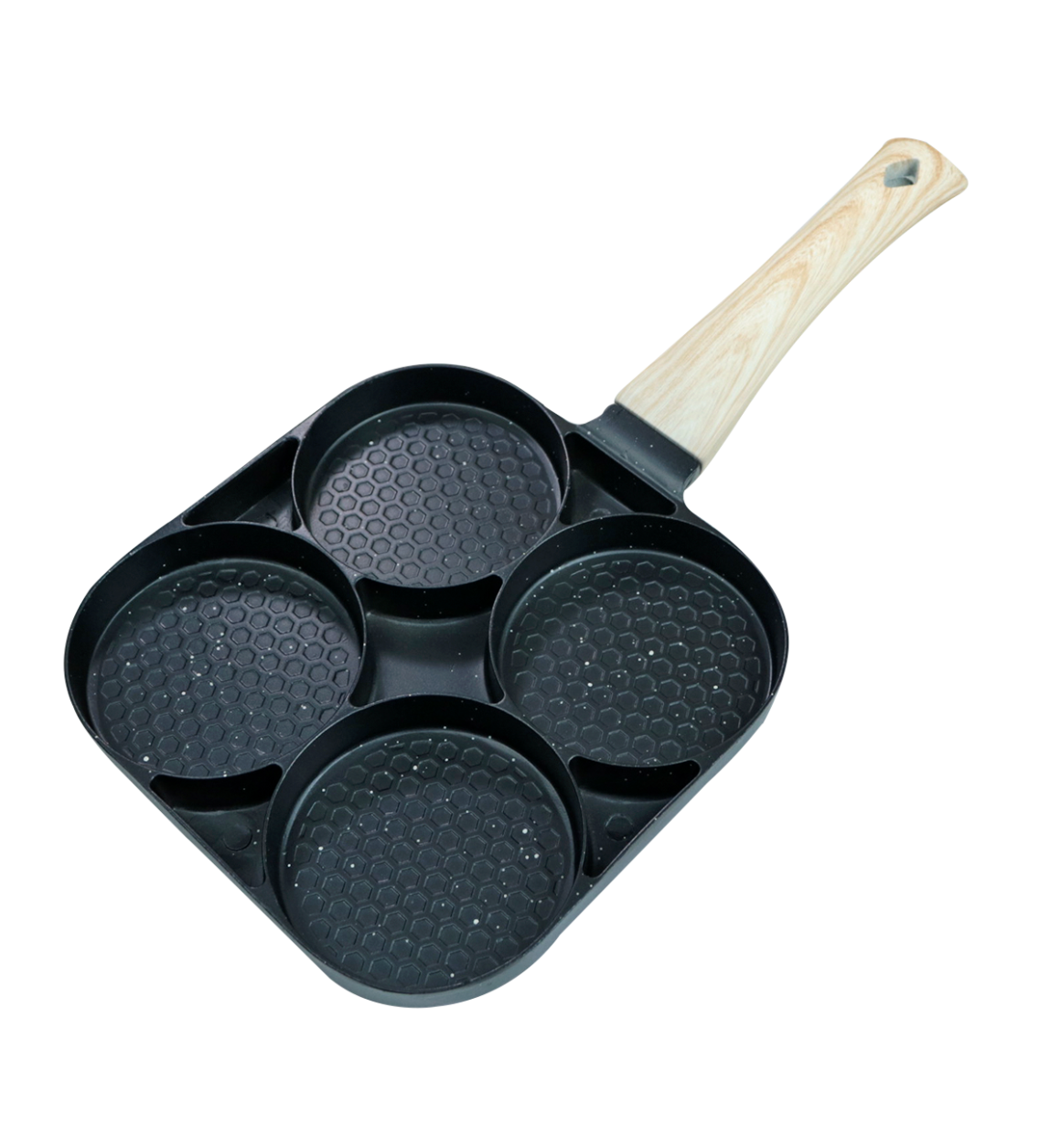Revestimento antiaderente, bom ajudante para você fritar alimentos. Design de 4 orifícios, conveniente para fazer 4 preparos ao mesmo tempo. Perfeito para fazer ovos fritos, carnes, legumes salteados, omeletes, etc. Uma ótima ferramenta de cozinha.