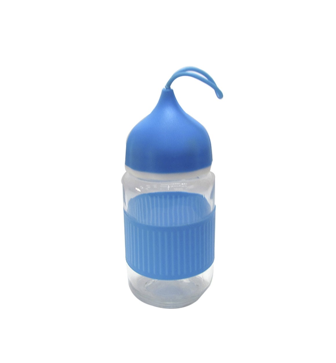 Garrafa de vidro com tampa de plástico e alça em silicone.