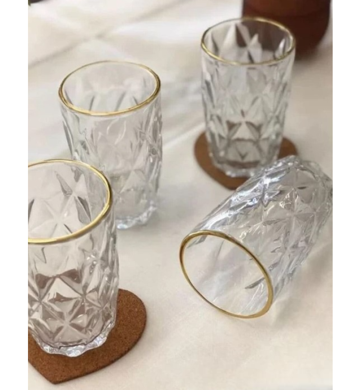 - Borda dourada delicada: Cada copo apresenta uma borda dourada que adiciona um charme clássico e refinado, valorizando o visual e conferindo um toque de glamour à mesa.