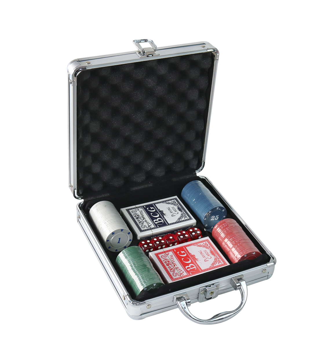 A maleta de Poker com chave é um conjunto completo para os amantes do jogo de cartas. Feita de material durável, como alumínio resistente, a maleta possui um acabamento elegante e vem com uma chave para travá-la, garantindo a segurança e a privacidade dos componentes internos. O conjunto também contém cinco dados que são usados para jogar diferentes variações de poker ou outros jogos. Eles são feitos de plástico e têm um tamanho padrão. A maleta contém 100 fichas de poker (25 de cada) e têm diferentes denominações, permitindo que os jogadores façam apostas em valores variados. Além disso o conjunto inclui dois baralhos completos de 52 cartas cada um. Os baralhos são feitos de papel de alta qualidade, com um acabamento suave e deslizante, permitindo uma fácil distribuição e manuseio das cartas. As faces das cartas têm designs clássicos e detalhados, facilitando a identificação de cada carta.