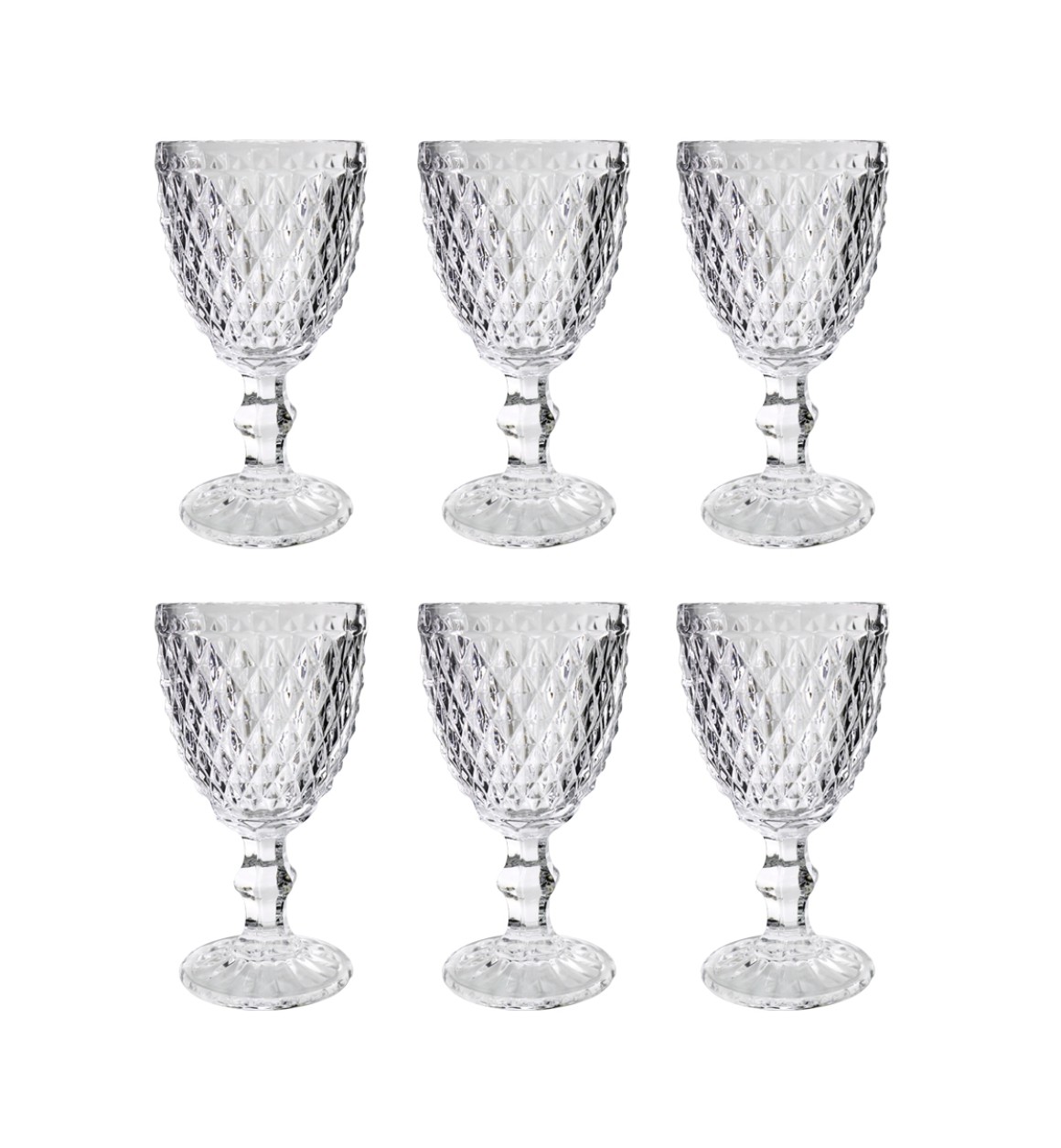 Jogo de 06 taças de vidros em alto relevo de bico de abacaxi são de ótima resistência e de fácil limpeza e armazenamento. Tem design moderno e vistoso. Ideal para composição de mesa posta onde as taças ocuparão lugar de destaque. Servem variados tipos de bebidas, como água, sucos ou refrigerantes.