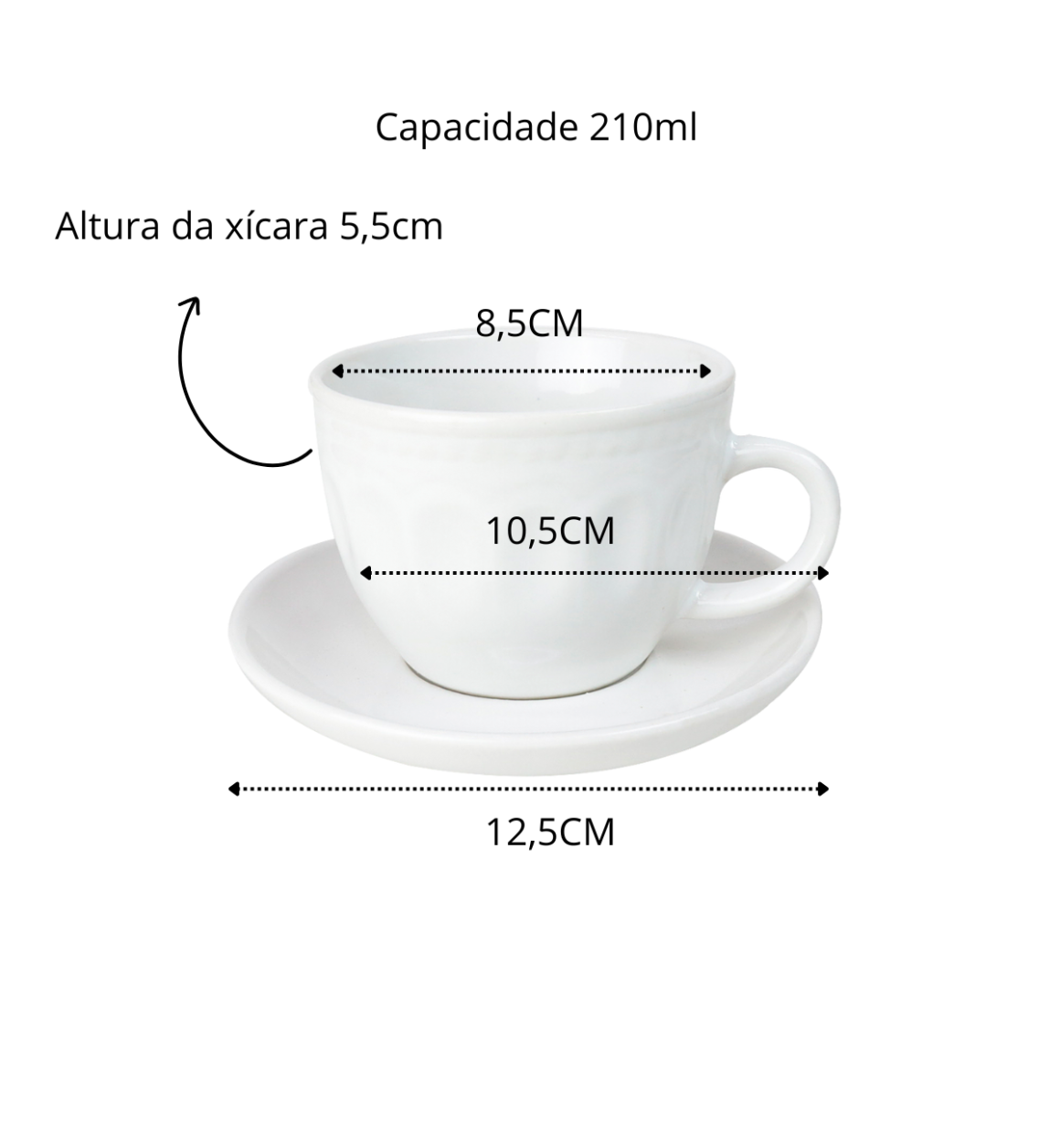 Sirva seu café ou chá com charme e elegância com este jogo de xícaras com pires de cerâmica branca, composto por 12 peças (6 xícaras e 6 pires). Cada xícara tem capacidade de 210ml, ideal para café ou chá, tornando seus momentos ainda mais especiais.