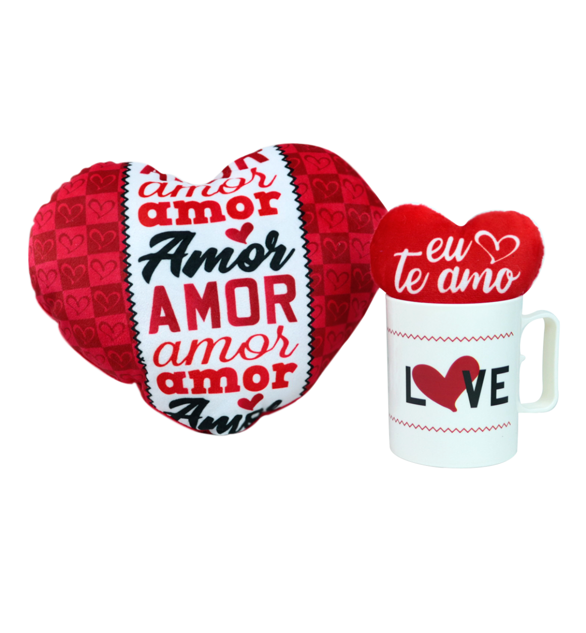 Ideal para presentear quem você ama. Almofada em formato de coração tamanho grande, uma caneca de plástico e um mini coração de poliester que acompanha ventosa e/ou poderá ser usado como chaveiro. Acompanha caixa com frase Eu Te Amo!