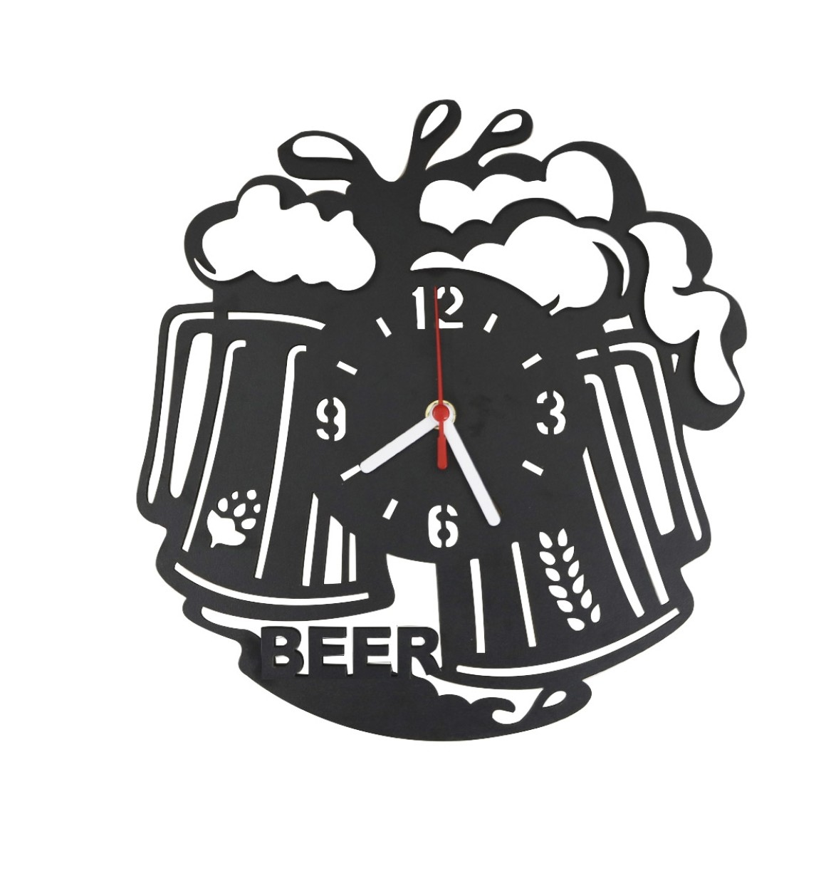Relógio em MDF Preto à pilha (modelo AA) com ponteiro das horas na cor Branca e o dos segundos em vermelho, além dos numerais vazados que na colocação em uma parede de cor neutra e clara é possível ter a visão das horas em maior nitidez. Com Símbolos de canecas de chopp com espuma na cor branca, assim como a escrita Beer (cerveja).