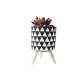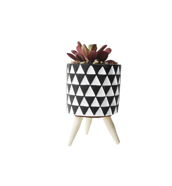 Vaso com pézinhos de madeira e desenhos geométricos. Com plantas suculentas artificiais diversas.